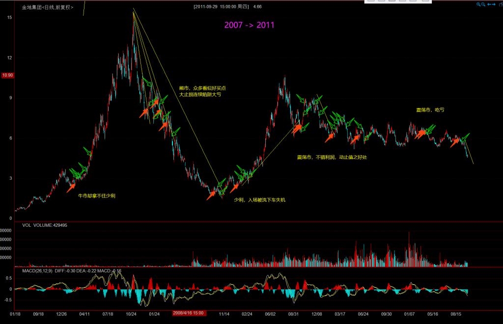 如上两图,2007-2015,牛市,熊市,震荡市,小牛市,都有。基本同样的行情也有好坏的两面结果。总的来说,把握几点: