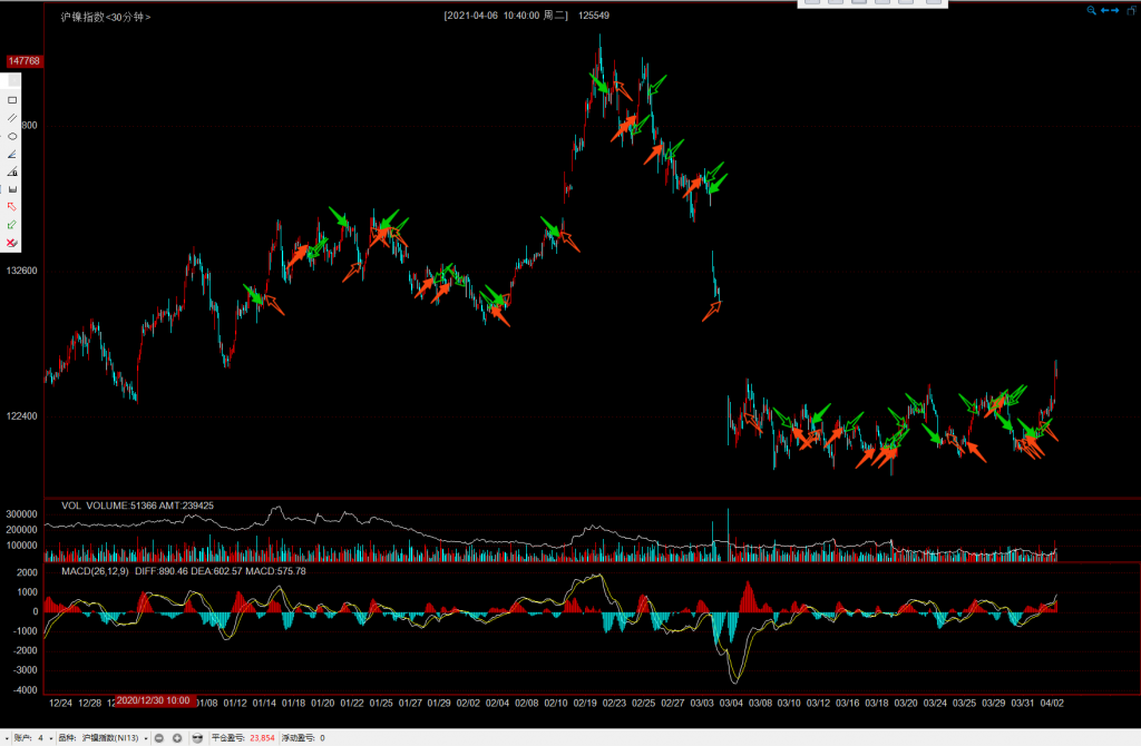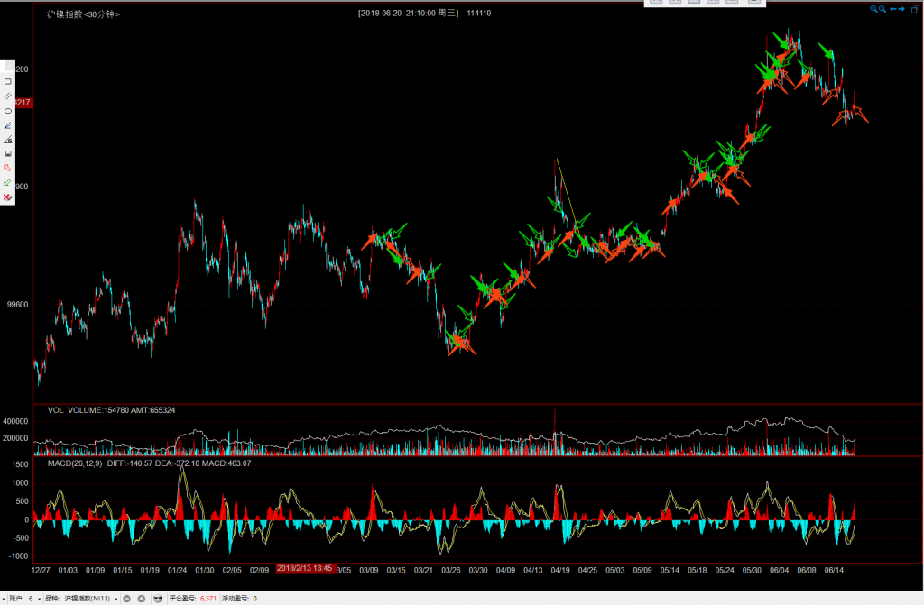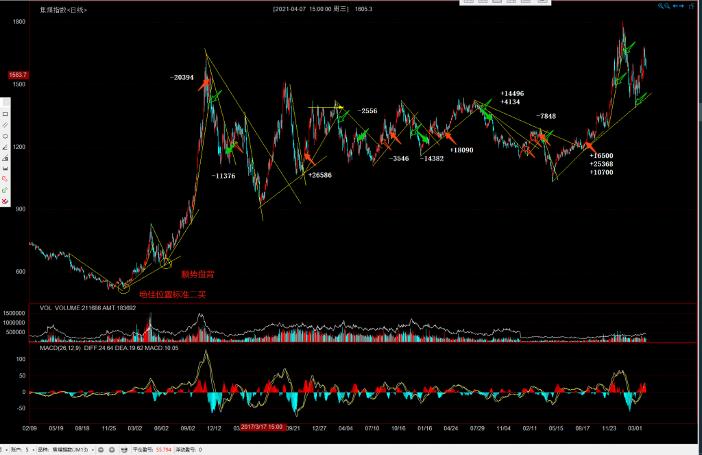 主要应用《专业投机原理》所述趋势线的画法,不断调整,判断趋势转折,二买卖入场。也有背离、盘背的方向判断。有时结构突破趋势线压制明显顺着开仓利润也很大很流畅止损也小。也有二买直接确立入场、趋势线回踩入场。出场结合背离、趋势线破,走势完美。