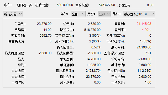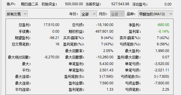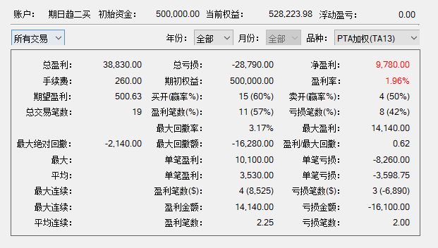 10年时间,交易19次,3手预计本金不超过2w,最大回撤-11775,最终利润99835,胜8负11,胜率42%。