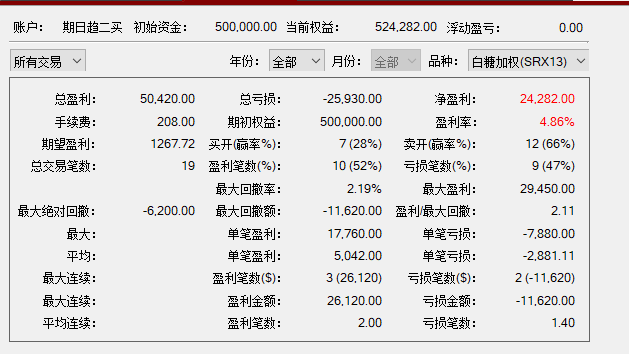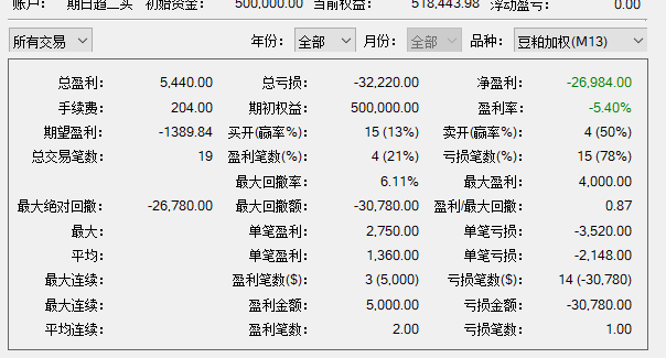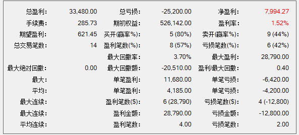 看出问题没有?3胜1平4负,胜率可以了,但是赚的不多。并非盈利单没有吃到过大行情,而是赢损比太小,最大一单12000的利润,而最大亏损-8000。