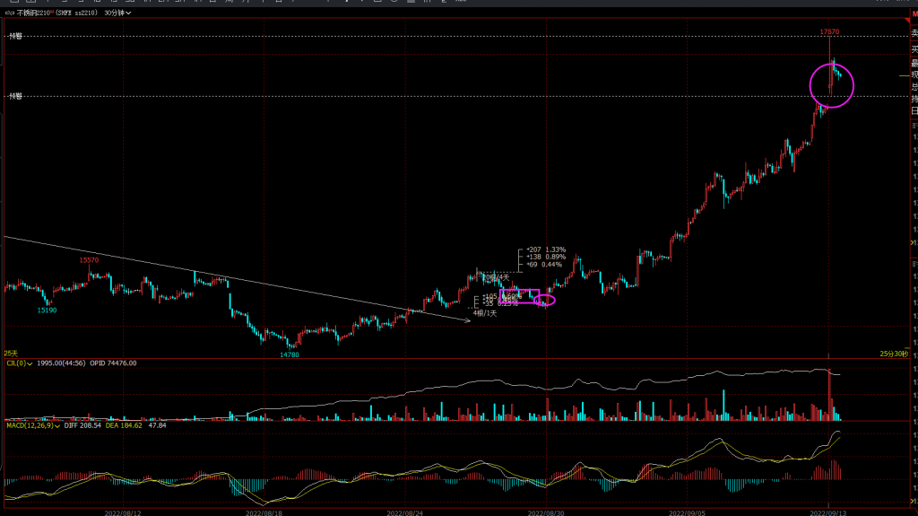 09.13复盘 在 13 9 月, 202213 9 月, 2022 上张贴 由 zhoukai发表回复 不锈钢这里是中秋节后,冲高出;虽然这个放量冲高意义不是很强,可能放掉机会。但是利润够了,保守点出掉,留待观察。 30min: 日线: