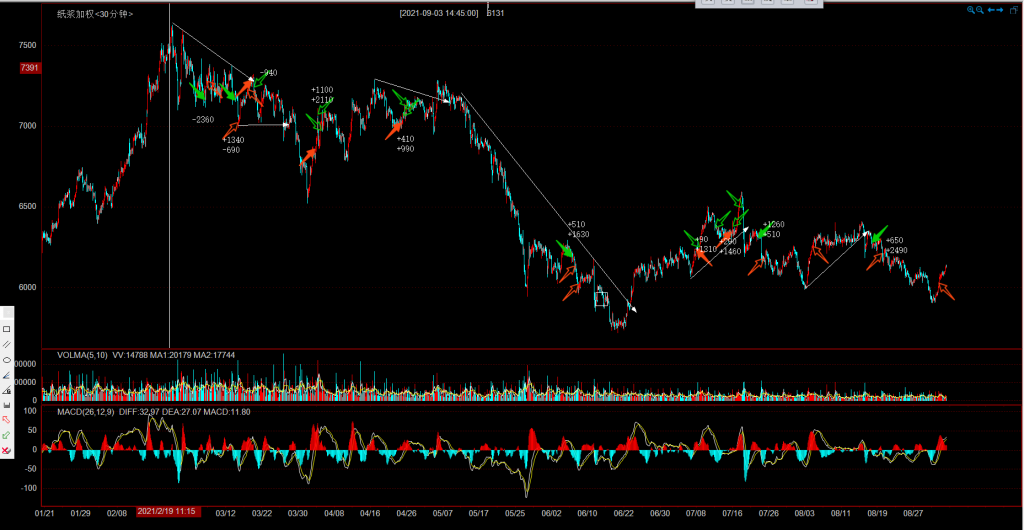 - 开仓:最后一笔下跌无力最好;一买预期后的反转更有力,或者道氏v;回调二买踩趋势线,最好强力分型中止带力度。